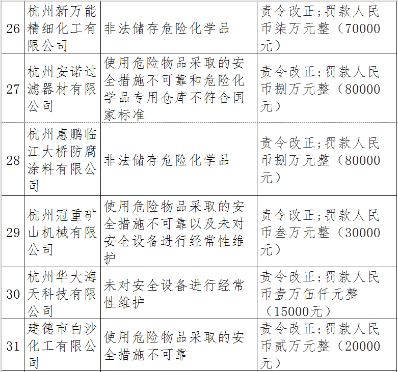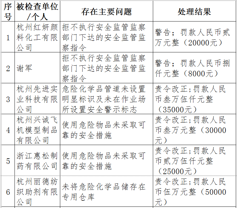 據(jù)了解,今年上半年,杭州市應急管理局一手抓駐企復工復產(chǎn)、一手抓安全生產(chǎn),已完成年度執(zhí)法計劃、專項檢查、聯(lián)合執(zhí)法、信訪舉報核查等,并對檢查中發(fā)現(xiàn)的安全生產(chǎn)違法違規(guī)企業(yè)(個人)進行了處罰。現(xiàn)對52家被行政處罰的企業(yè)(個人)進行曝光,希望各企業(yè)引以為戒!