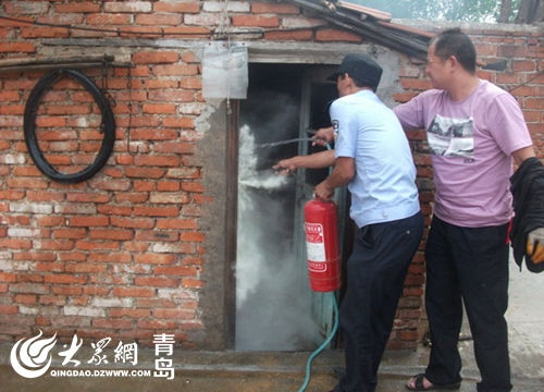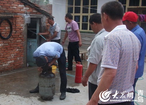 7月25日13時,黃島公安分局理務關派出所接到群眾報警,村民曲大娘在廚房給老伴煮綠豆湯時煤氣罐突然起火。接警后,理務關派出所民警立即趕到現(xiàn)場,發(fā)現(xiàn)煤氣罐在西屋廚房內,煤氣罐軟管接口脫落,接口處正在噴火,并且已經(jīng)引燃了附近的桌子,十分危險。民警迅速靠近火勢區(qū)域,頂著濃煙先將煤氣閥關閉,然后和附近群眾一起利用滅火器對廚房內可燃物進行噴灑,并用打濕的衣物蓋在液化氣罐上對罐體進行冷卻,成功化解了險情。此時,曲大娘懸著的心也放了下來。