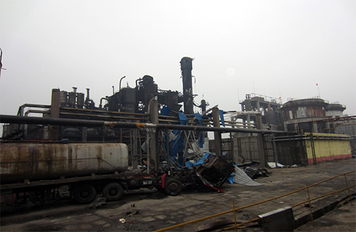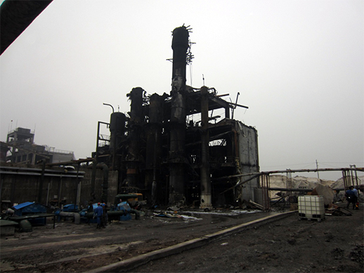 | 8月25日 | 18:46:22 | 氧化塔爆炸,并相繼引燃了氧化塔周邊氫化塔、萃取塔等設(shè)備中的物料。爆炸導(dǎo)致在四層平臺(tái)取樣的張某、一層北側(cè)檢查的秦某和程某當(dāng)場(chǎng)死亡;并導(dǎo)致雙氧水車間南300米的氯堿車間氯氣管道受損,造成少量氯氣泄漏;爆炸碎片和泄露的氯氣導(dǎo)致雙氧水車間辦公室朱康康,中控室鄭某、金某、秦某,氯堿車間荊某、秦某和水泵房張某等7人受傷。 |