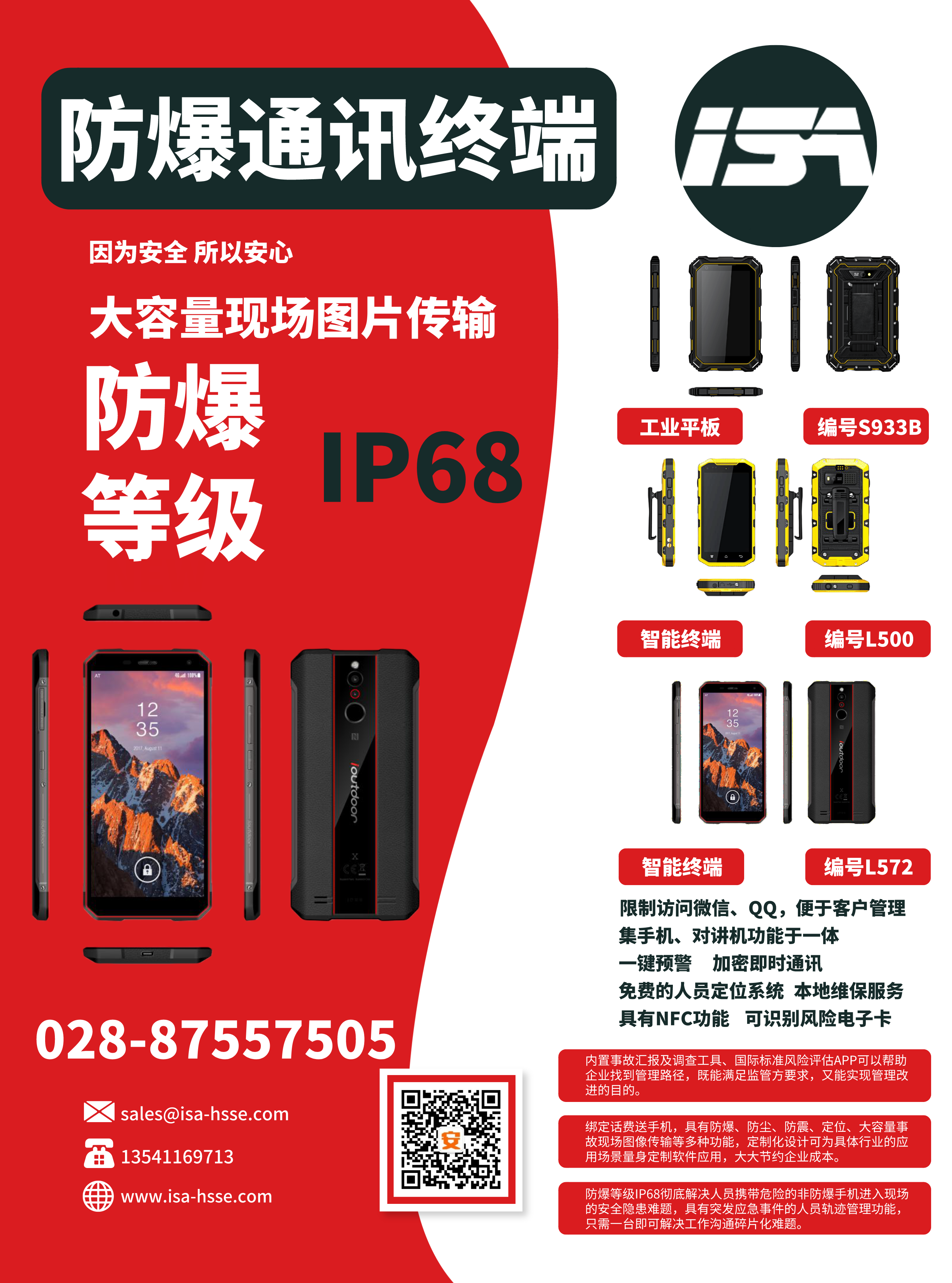 公司與運(yùn)營商推出一款集手機(jī)、對講機(jī)于一體的防爆手持終端,包括各類商業(yè)安全軟件的使用、圖像回傳功能、一鍵報(bào)警、限制訪問微信QQ、NFC等功能。內(nèi)含事故管理APP(隱患排查、風(fēng)險(xiǎn)評估),0元開卡,綁定即送話費(fèi)流量,支持定制化服務(wù)。